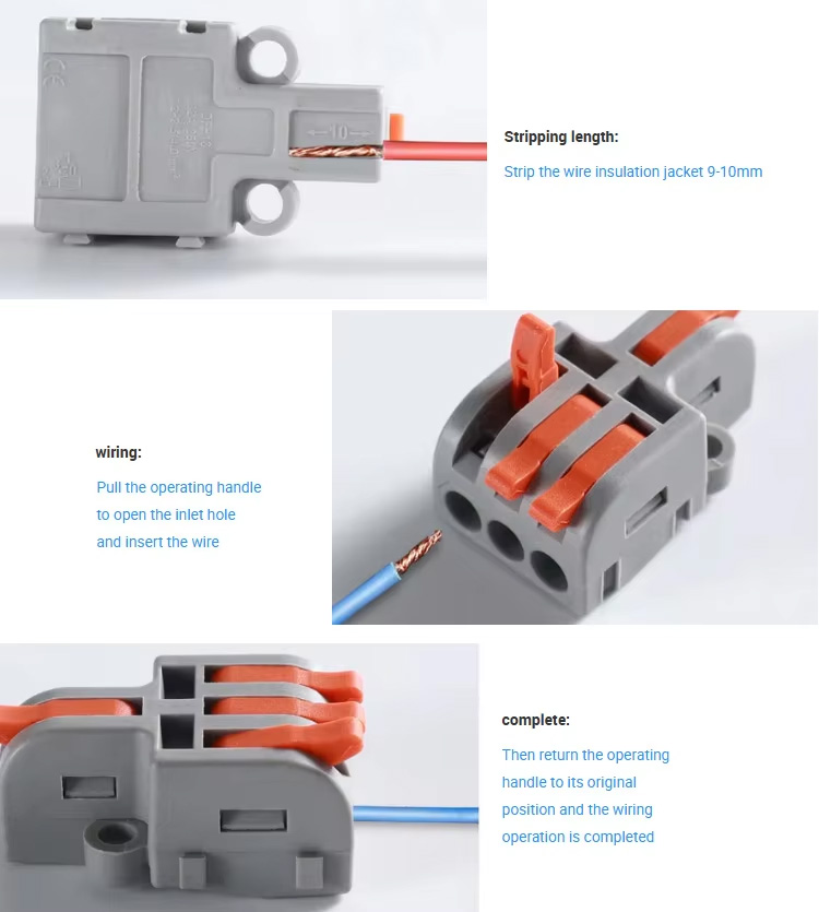 Ampla compatibilidade com fios: Adequado para fios sólidos de 18-12 AWG/0,08-4 mm² e fios trançados de 0,08-2,5 mm²; comprimento de decapagem de 9 a 10 mm.