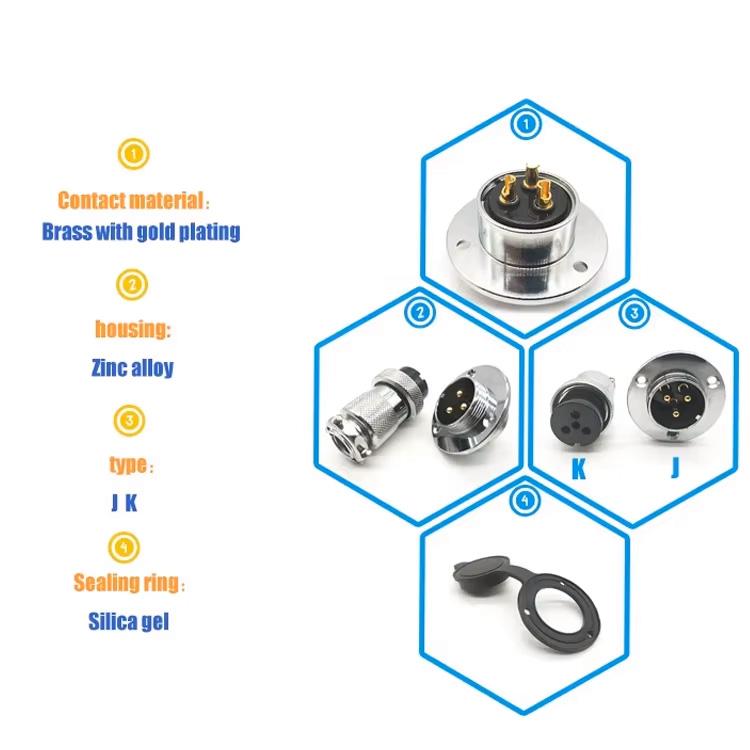 O conector elétrico circular tipo GX é adequado para conexão de linha entre instrumentos, equipamentos mecânicos e eletrônicos. O plugue e a tomada são conectados por rosca, o que tem as vantagens de estrutura simples, aplicação conveniente e aparência bonita.