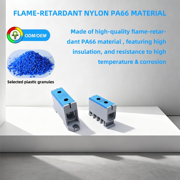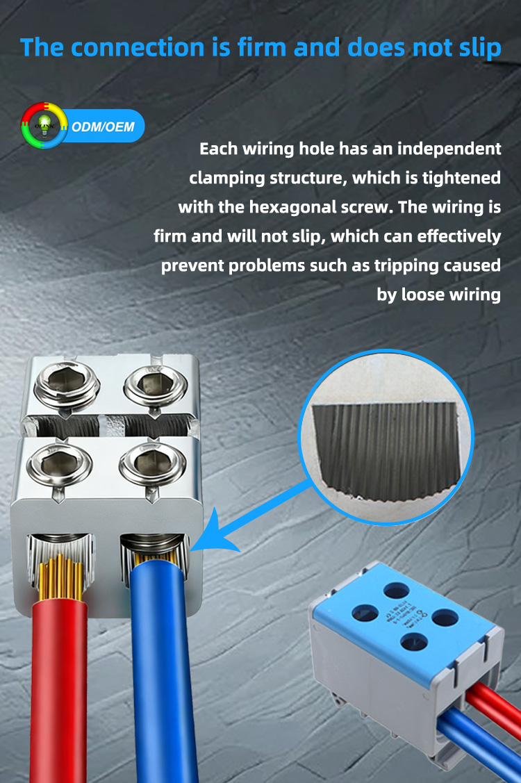 Os condutores de alumínio espesso oferecem leveza, grande seção transversal e excelente resistência à corrosão. O novo nylon PA66 suporta altas temperaturas e pressões, mantendo excelente desempenho em diversos ambientes agressivos. Com parafusos sextavados, afrouxe-os antes de conectar os fios e aperte-os após a conexão para garantir uma ligação segura e durável.